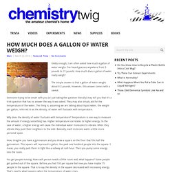 Typically in the liquid form, a gallon of water weighs about 8 pounds using the standard liquid united states measurement. How much does a gallon of oily water weigh? An imperial gallon (uk) weighs 10.022 lbs or 4.546 kg, at its most dense temperature, which is 2.20456 lbs / l at 4 °c or 39 °f. Turn the heating way up to 200ºf though, and a gallon of water will weigh around 8.04lb. Mar 12, 2017 · answer: